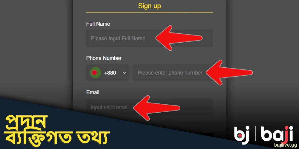 বাংলাদেশী খেলোয়াড়রা অফিসিয়াল ওয়েবসাইটের ডেস্কটপ বা মোবাইল সংস্করণ ব্যবহার করে Baji সাইন আপ করতে পারে, অথবা তারা মোবাইল অ্যাপের মাধ্যমেও নিবন্ধন করতে পারে। সব ক্ষেত্রে, আপনাকে হেডারে “সাইন আপ” বোতামে ক্লিক করতে হবে, রেজিস্ট্রেশন ফর্ম খোলার জন্য অপেক্ষা করতে হবে, এবং তারপর এই পদক্ষেপগুলি অনুসরণ করুন: